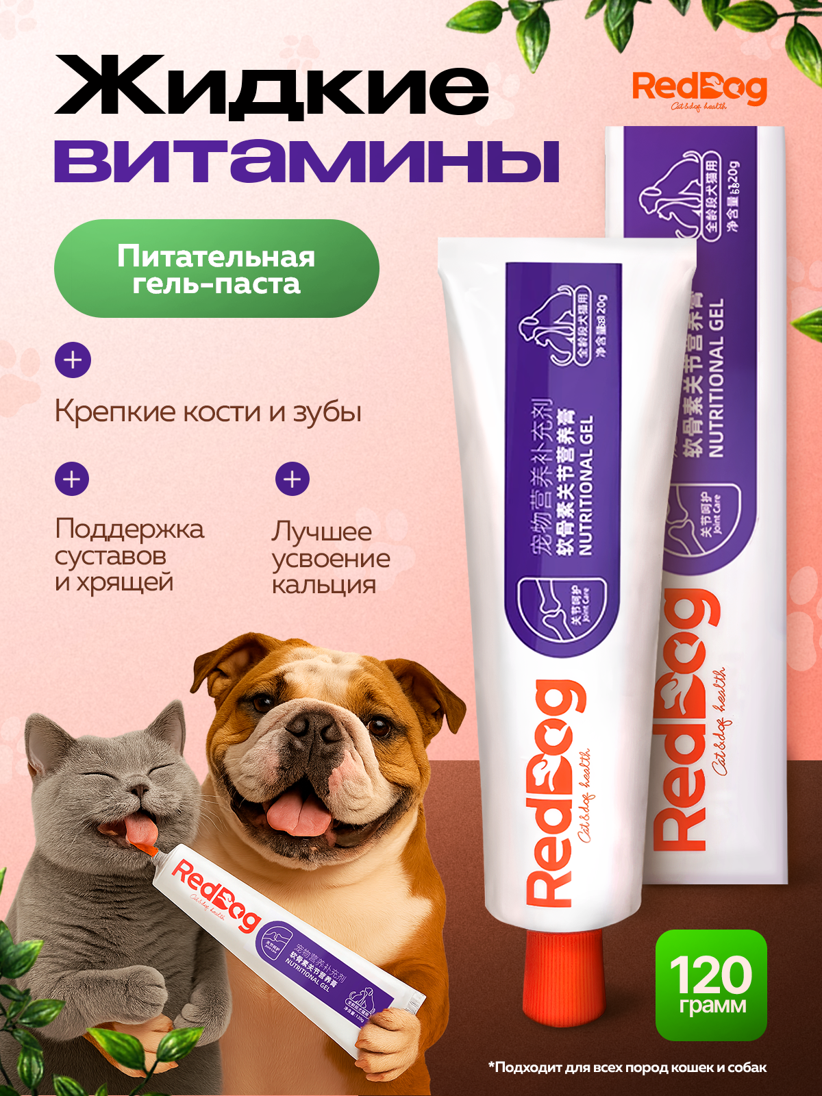 RedDog JointCare Nutritional Gel — гель-паста для суставов и костей у кошек и собак. Содержит хондроитин, кальций (в т.ч. молочный), витамин D3 и CPP, а также рыбий жир (омега-3) — поддерживает хрящи и подвижность суставов, улучшает усвоение кальция, помогает укреплять кости и зубы. Подходит в период роста и смены зубов, при повышенных нагрузках, возрастной скованности и в период восстановления.